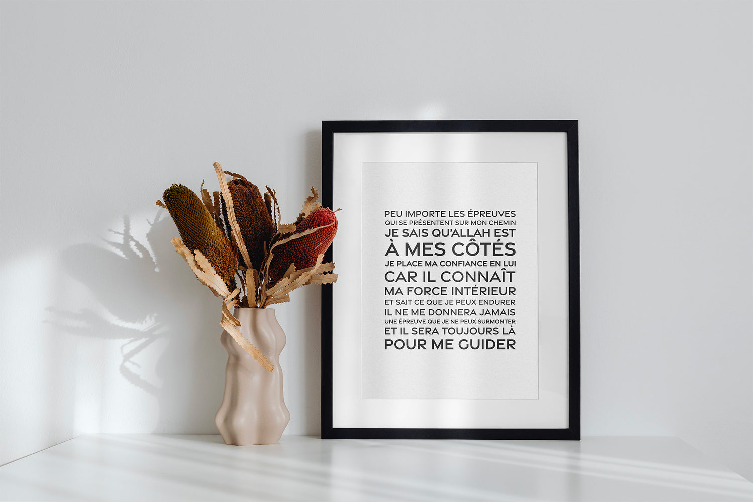 Cette affiche est bien plus qu’un simple élément de décoration : c’est un message de confiance et de sérénité face aux épreuves. Avec ses mots réconfortants, elle te rappelle qu’Allah est toujours à tes côtés, te guidant à travers chaque défi.